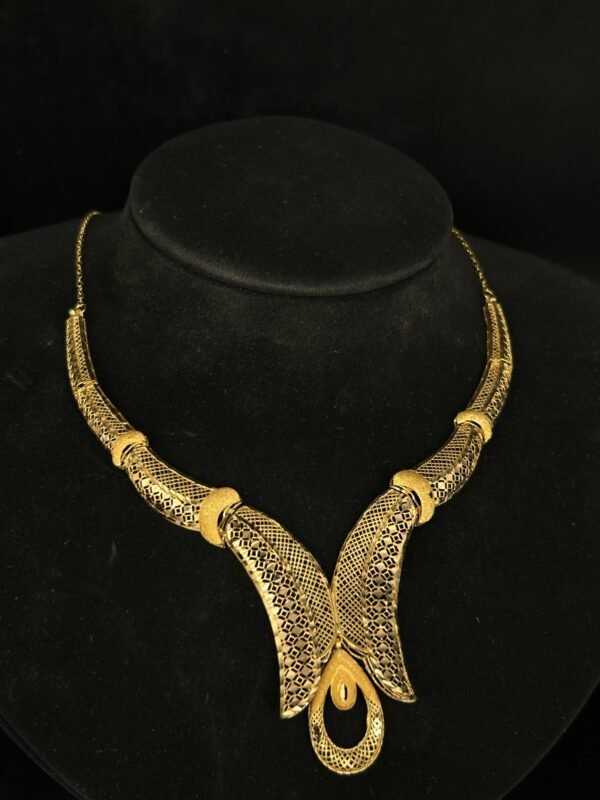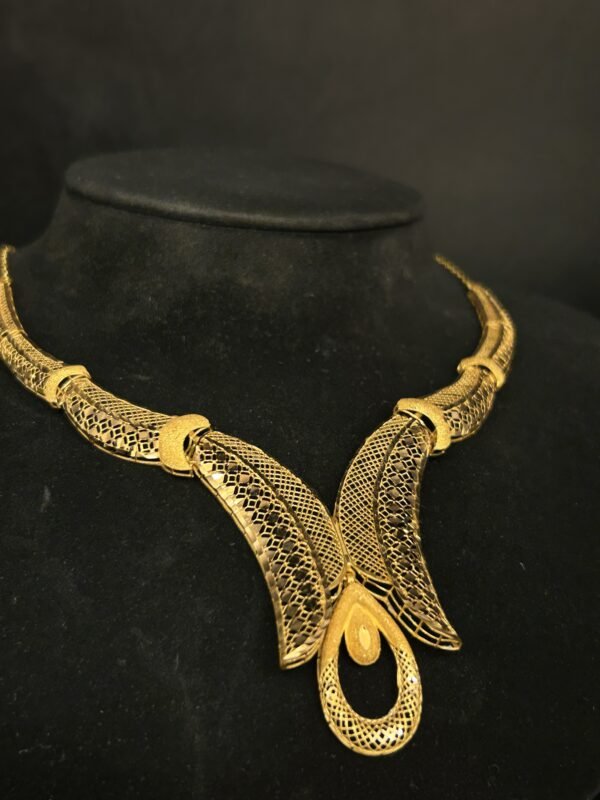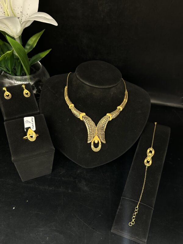 يقدم طقم الذهب عيار 21 أناقة لا تضاهى وتصميماً فريداً يتناسب مع جميع المناسبات. هذا الطقم مصمم بعناية ليبرز جمالك أينما كنت. تألق مع قطعة ذهبية تعكس شخصيتك وتضفي لمسة راقية على إطلالتك اليومية أو في المناسبات الخاصة.