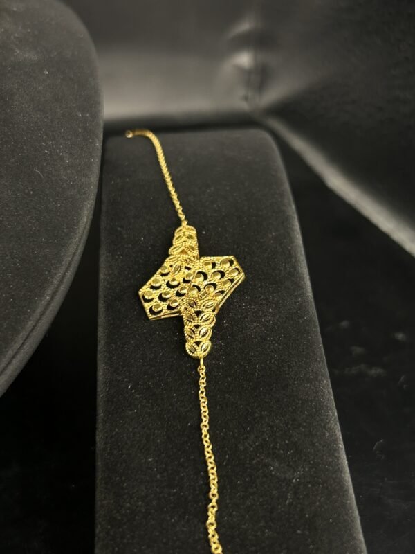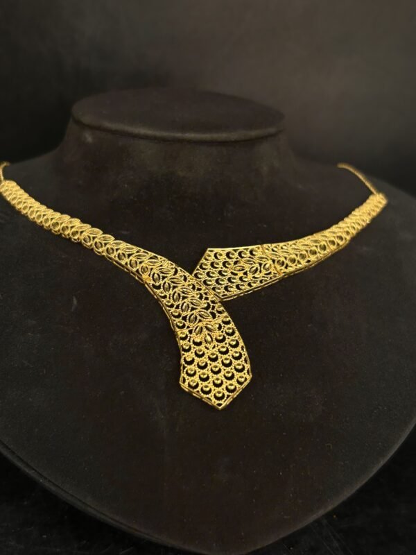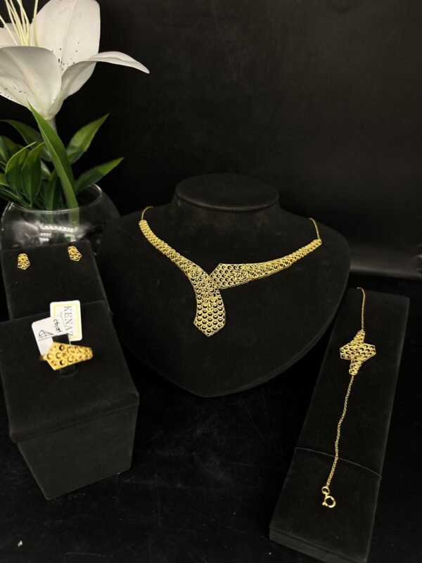تم صنع هذا الطقم باستخدام أجود الخامات مع الحفاظ على نقاء الذهب عيار 21، وهو العيار المثالي الذي يجمع بين القوة والجمال. يقدم الطقم تفاصيل متقنة وأشكالاً تضيف لمسة من الأناقة، مما يجعله استثمارًا مثاليًا لمحبي المجوهرات الراقية.