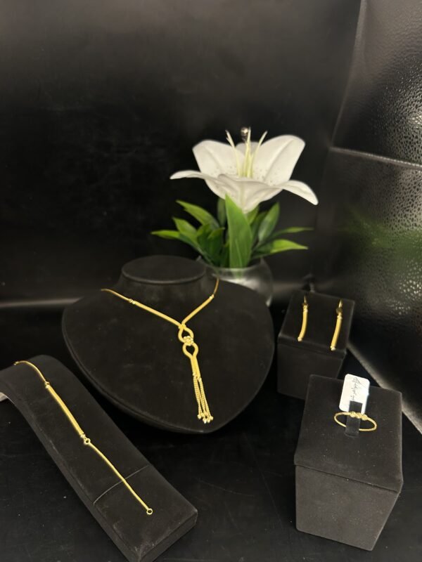 طقم الذهب مصنوع وفقًا لأرقى المعايير، مما يجعله قطعة فنية لا مثيل لها. يشتمل الطقم على قلادة أنيقة، أقراط راقية، وسوار جميل ينسجم بشكل مثالي لإكمال الإطلالة. الذهب عيار 21 يوفر لمعانًا رائعًا ولمسة ناعمة على البشرة، إلى جانب متانة تحافظ على جماله مع مرور الوقت.