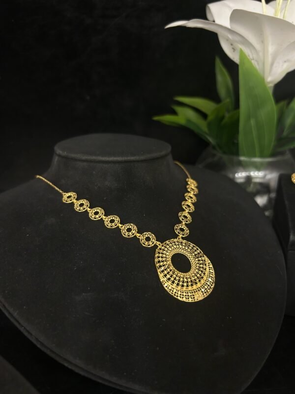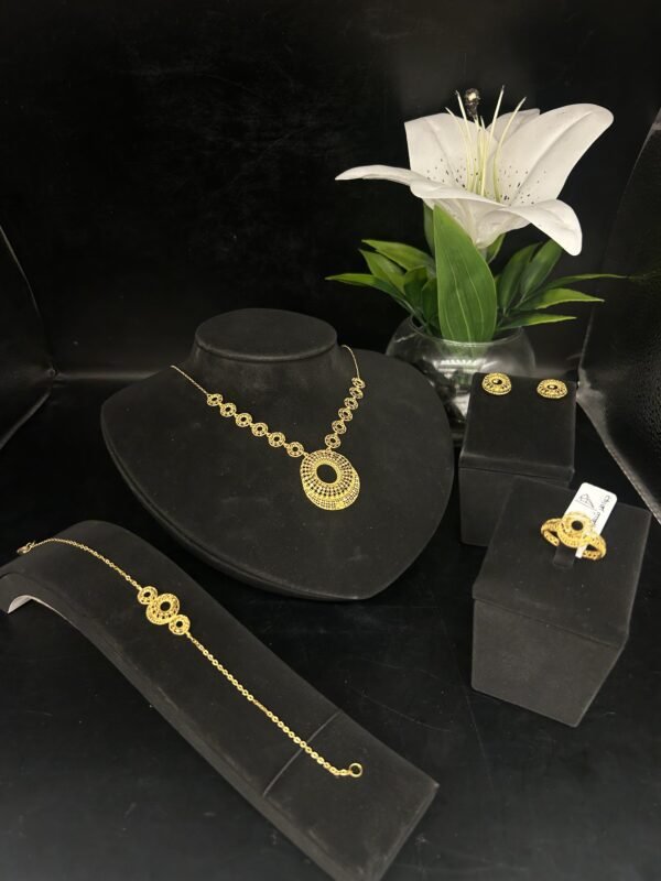 طقم الذهب عيار 21 يقدم لك لمسة من الفخامة والأناقة التي تناسب جميع الأذواق والمناسبات. تم تصميم هذا الطقم بمهارة عالية ليمنحك إطلالة مميزة تلفت الأنظار وتعكس شخصيتك الفريدة.
