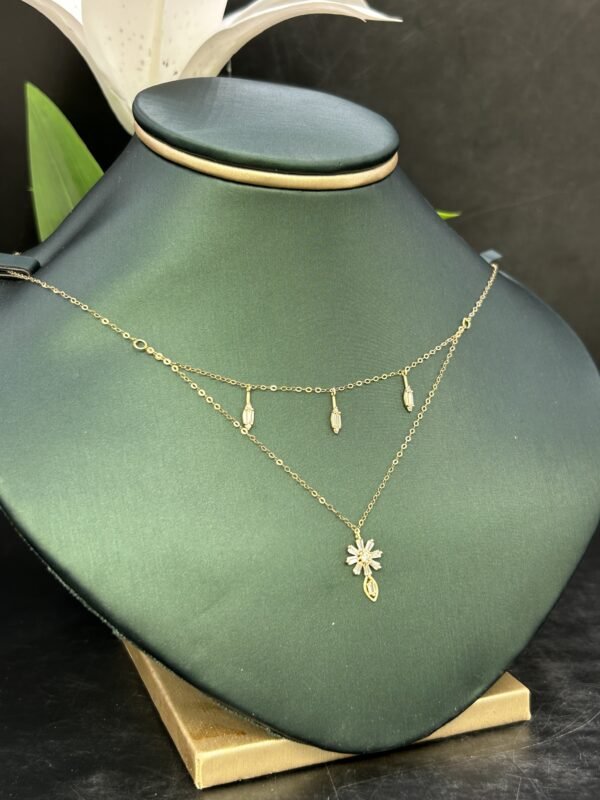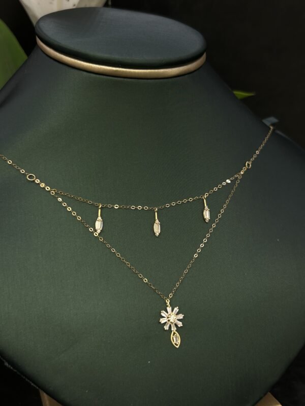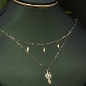 يتكون العقد من ذهب عالي الجودة عيار 18، مما يضمن بقاءه لامعاً ومتيناً لفترة طويلة. الطبقتان المميزتان للتصميم تضيفان عمقاً وجمالاً للعقد، ليصبح قطعة فنية تندمج بسلاسة مع مختلف أشكال الملابس. وزنه خفيف ومريح، يعزز الإحساس بالراحة أثناء ارتدائه طوال اليوم. هذا العقد يعد خياراً رائعاً لمن يبحثون عن مزيج بين الجودة والتصميم الراقي.