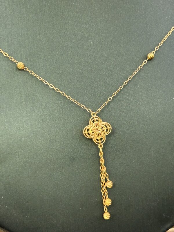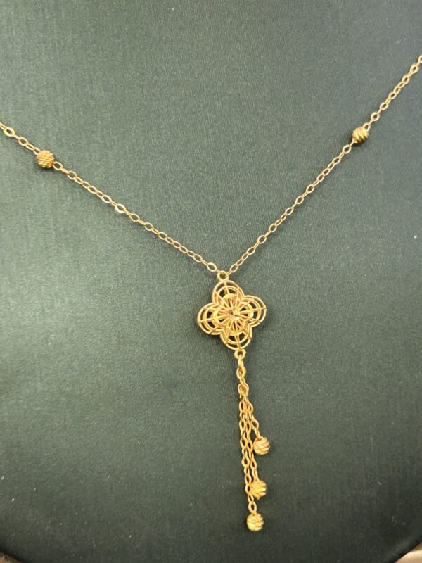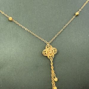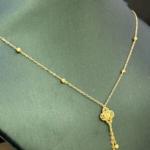 تم تصنيع عقد الذهب عيار 21 من الذهب الأصلي ذو النقاء العالي، مما يعكس جماله وطابعه الفريد. يضمن لك التصميم المتين طول عمر القطعة مع الحفاظ على تألقها. إن العناية بأدق التفاصيل خلال عملية التصنيع تعكس الحرفية الدقيقة والاهتمام بجودة المنتج.